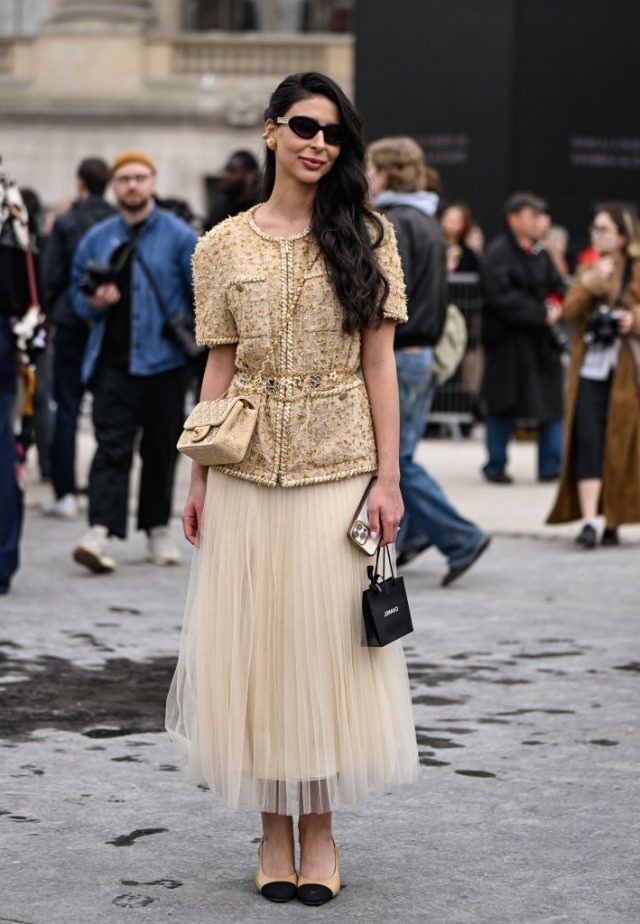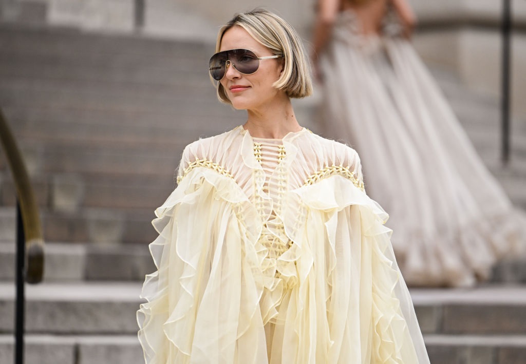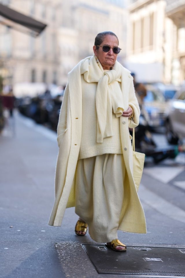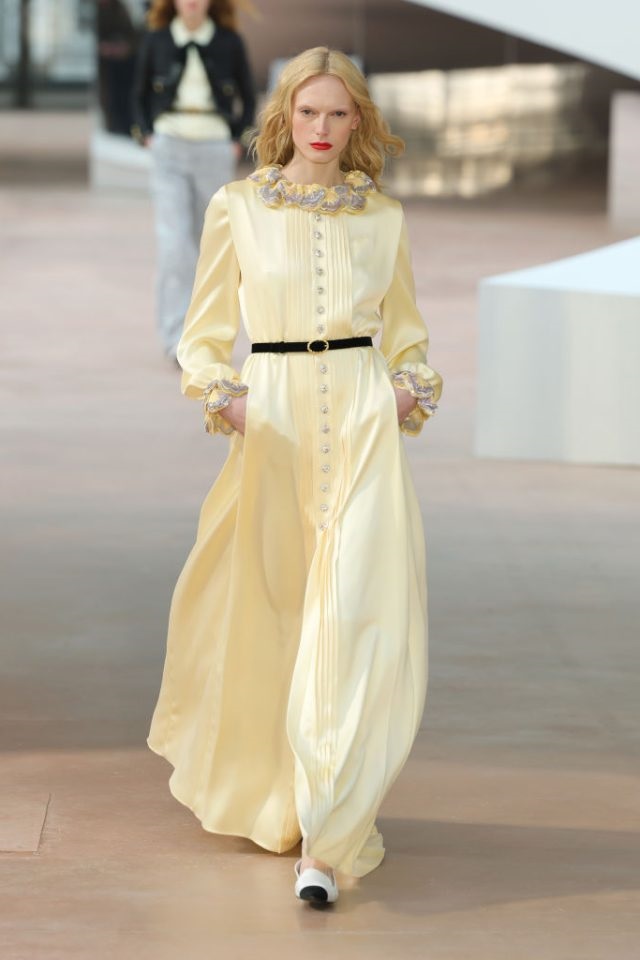 Масляно-жёлтый стал заметен не только на ковровых дорожках, но и на показах весна-лето 2025: он появился в виде полупрозрачных брюк, приталенных платьев Alaïa, кожаных аксессуаров Toteme, а также в коллекциях Chanel — в длинных плиссированных платьях и элегантных комбинезонах.
