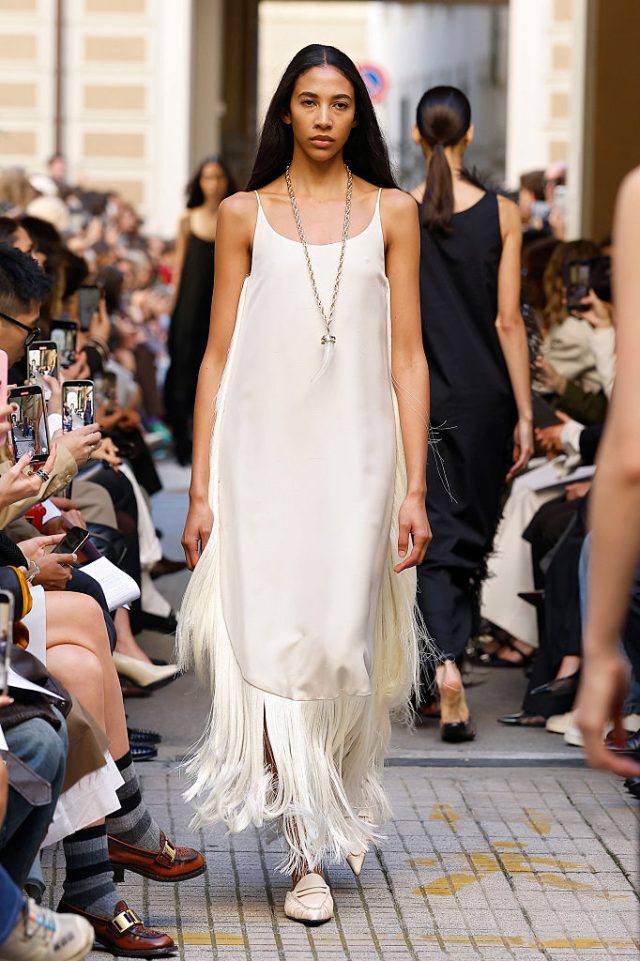 Бахрома становится одной из самых заметных деталей сезона. Она придаёт образу динамику и напрямую связана с идеей «живой» моды. Особенно актуальны макси-платья с бахромой, асимметричные модели и вещи с деликатными декоративными элементами. Такие детали делают силуэт более выразительным и добавляют образу лёгкости и движения.