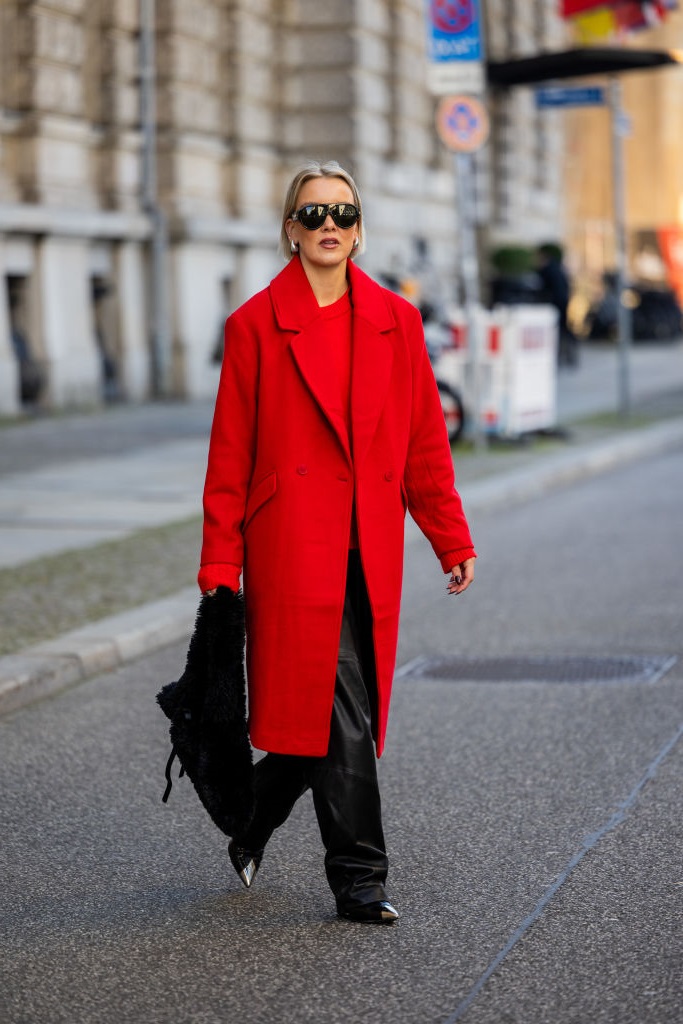 Если total look кажется слишком смелым шагом, обратите внимание на более сдержанный, но не менее выразительный вариант. Зима требует тёплого пальто, и почему бы не выбрать красное? Длинное, уютное, возможно, в формате пальто-«мишка». Оно прекрасно сочетается с чёрным платьем, объёмным свитером или кожаными брюками.