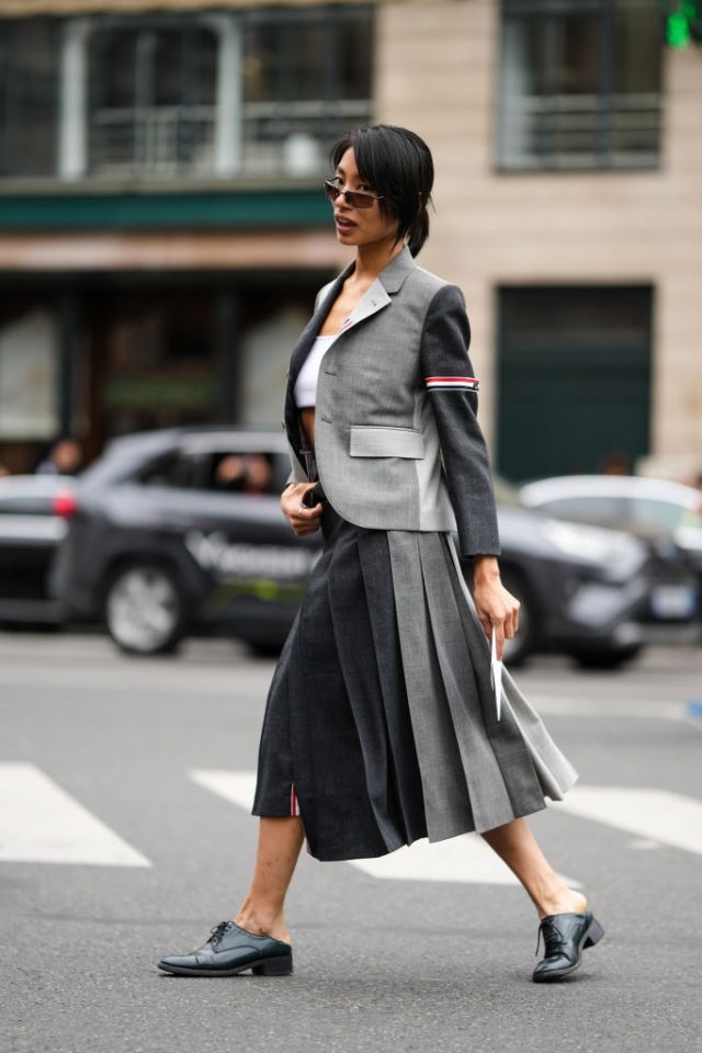 Начнём с простого правила: серый отлично сочетается со светлыми и яркими оттенками. Серые брюки с ярким свитером станут отличным офисным образом. Серый костюм с контрастной рубашкой или поло — всегда элегантный выбор. В этом сезоне особенно популярны клетчатые костюмы и жакеты. Серые юбки можно носить ниже колена, если вы высокая, или чуть выше — в зависимости от фигуры. А серые туфли? Они прекрасно завершат образ с одеждой чёрного, белого, а также фиолетового или жёлтого оттенка, добавив сдержанности и гармонии.